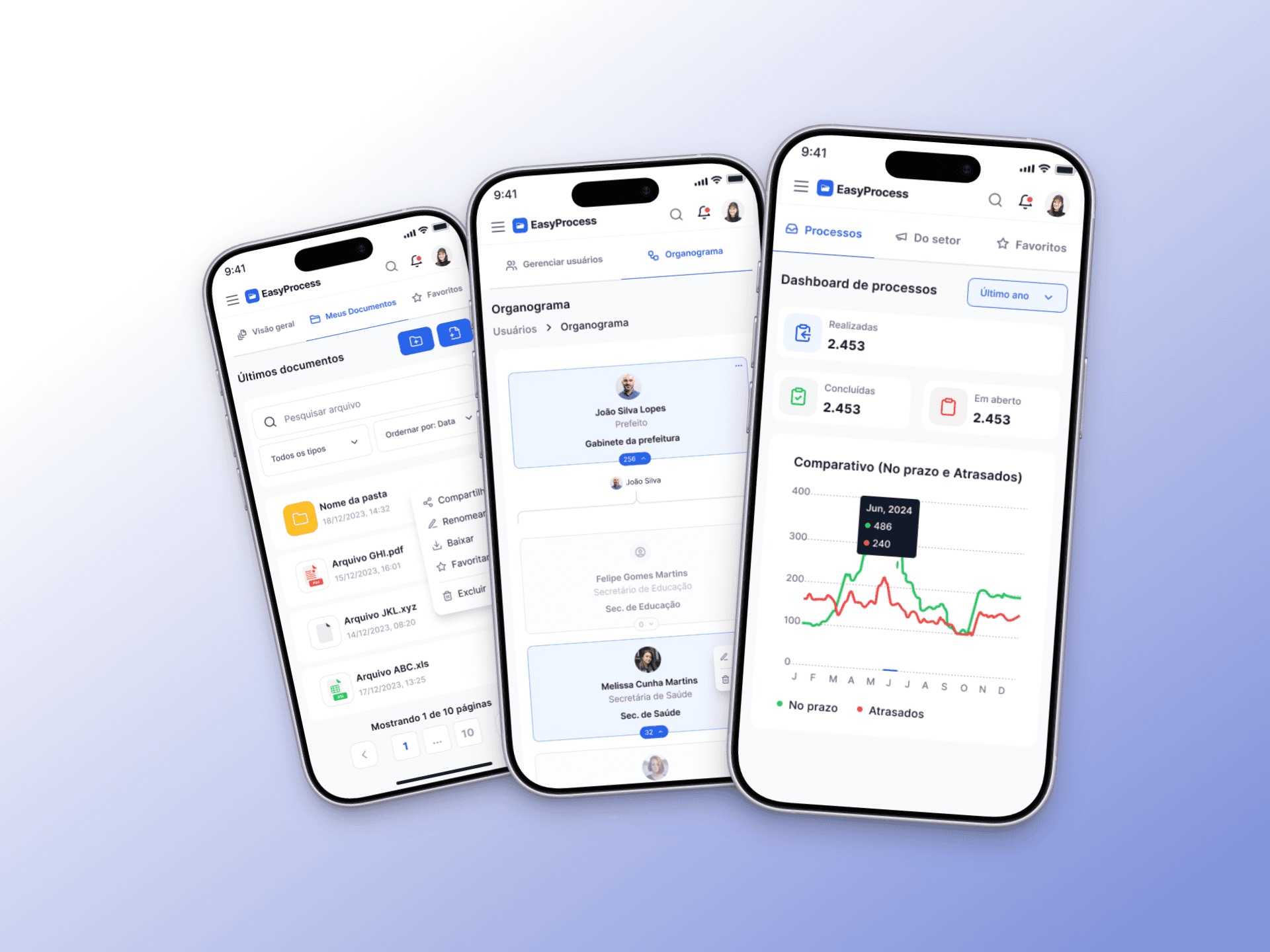 Comunicação interna, documentos, processos administrativos, solicitações de serviços, hierarquia organizacional e dados abertos, tudo em um só lugar.